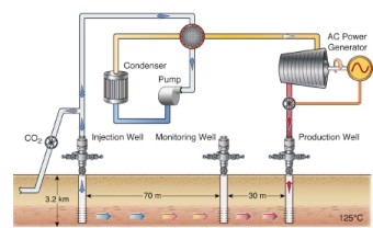 ?? 由美國勞倫斯伯克利國家實驗室科學家領(lǐng)導的一個研究小組,希望成為世界上首個利用二氧化碳通過地熱發(fā)電的團隊,他們還希望將二氧化碳永久存儲到地下。這個研究小組早些時候得到美國能源部500萬美元的資助開始設(shè)計和測試這項技術(shù)。伯克利實驗室地球科學部表示,這是利用地熱加熱二氧化碳來進行發(fā)電的首個項目。 研究人員的想法是將二氧化碳注入到地下三公里125℃的沉積層。在這些條件下,二氧化碳成為超臨界狀態(tài),這意味著它同時具有液態(tài)和氣態(tài)屬性。然后,二氧化碳被抽回地面,推動汽輪機,利用熱力發(fā)電。接著,再將二氧化碳注入到地下循環(huán)利用。隨著時間的推移,有一部分二氧化碳也會永久封存到地下。更多的二氧化碳會不斷注入到系統(tǒng)中驅(qū)動汽輪機轉(zhuǎn)動。