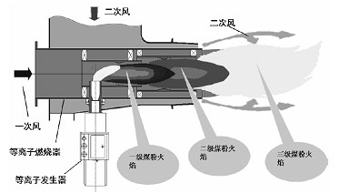 等離子點(diǎn)火技術(shù)示意圖 按上圖所示,一次風(fēng)送入等離子燃燒器,煤粉經(jīng)濃淡分離后,濃煤粉進(jìn)入電弧核心,在約1/10秒內(nèi)迅速著火,并穩(wěn)定燃燒;淡煤粉在補(bǔ)入二次風(fēng)后借助已燃煤粉火焰燃燒;燃燒器向爐內(nèi)噴出煤粉炬,待達(dá)到一定的爐膛溫度時(shí),投入主燃燒器啟動(dòng)鍋爐。 (國(guó)家能源局能源節(jié)約和科技裝備司) |