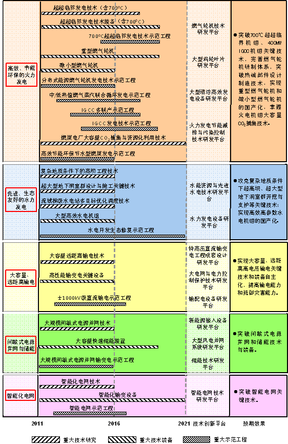 三是發(fā)電與輸配電技術(shù)領(lǐng)域。我國電力穩(wěn)定供給主要依靠火力發(fā)電、水力發(fā)電。電網(wǎng)支撐了電力安全輸送、電力電量平衡和用戶的可靠使用。先進的發(fā)電和輸配電技術(shù)是保證我國電力工業(yè)健康、可持續(xù)發(fā)展的重要基礎(chǔ)。《規(guī)劃》將“發(fā)電和輸配電技術(shù)”作為第三項能源科技重點技術(shù)領(lǐng)域,確定了高效節(jié)能環(huán)保的火力發(fā)電技術(shù)、先進生態(tài)友好的水力發(fā)電技術(shù)、大容量遠距離輸電技術(shù)、間歇式電源并網(wǎng)和大規(guī)模儲能技術(shù),以及智能化電網(wǎng)技術(shù)等5個能源應(yīng)用技術(shù)和工程示范重大專項,并按照“四位一體”的框架規(guī)劃了“十二五”期間能夠?qū)崿F(xiàn)產(chǎn)業(yè)化及未來10年有望取得突破的重點技術(shù)發(fā)展路線圖。