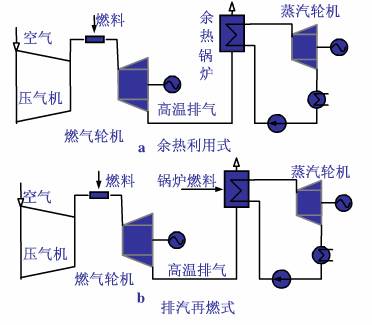 燃?xì)廨啓C(jī)聯(lián)合循環(huán)(gas turbine combined-cycle,GTCC),又稱燃?xì)狻羝?lián)合循環(huán),是指將燃?xì)廨啓C(jī)和蒸汽輪機(jī)組合起來的一種發(fā)電方式,主要由燃?xì)廨啓C(jī)(壓氣機(jī)、燃燒室、透平、控制系統(tǒng)和輔助系統(tǒng))、余熱鍋爐、蒸汽輪機(jī)三部分構(gòu)成。常用的GTCC發(fā)電方式有余熱利用式和排氣再燃式兩種(見下圖)。