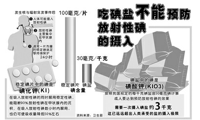 ???? 碘鹽中碘的存在形式是碘酸鉀,我國(guó)規(guī)定碘鹽的碘含量為30毫克/千克,按人均每天食用10克碘鹽計(jì)算,可獲得0.3毫克碘。成人需要一次攝入碘鹽約3千克,才能達(dá)到預(yù)防的效果,遠(yuǎn)遠(yuǎn)超出人類能夠承受的鹽的攝入極限。因此,通過(guò)食用碘鹽預(yù)防放射性碘的攝入是無(wú)法實(shí)現(xiàn)的。 |