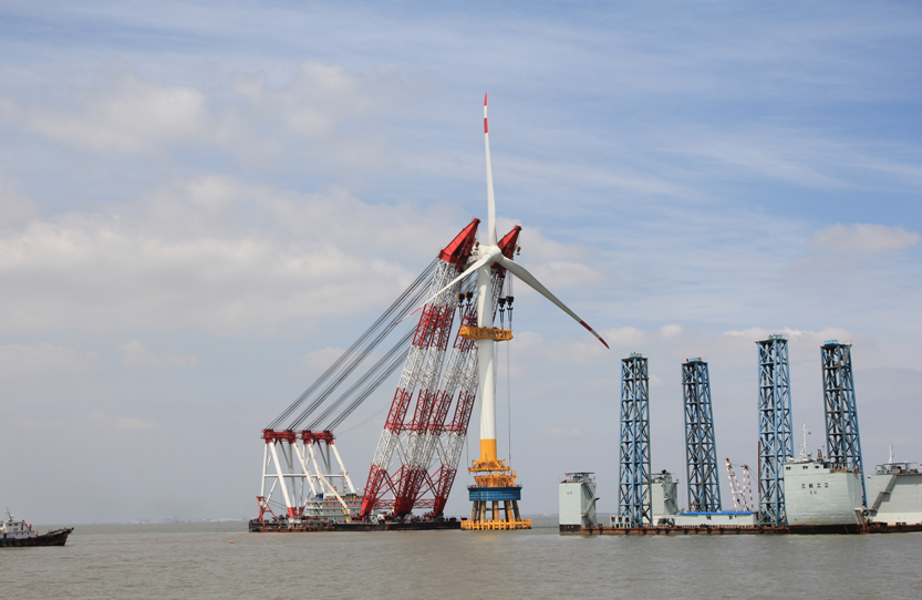 ????2011年,3兆瓦風電機組批量生產(chǎn),5兆瓦風電機組已經(jīng)下線。圖為我國自主制造的亞洲首臺3兆瓦海上風電機組在上海東海大橋吊裝成功。? |