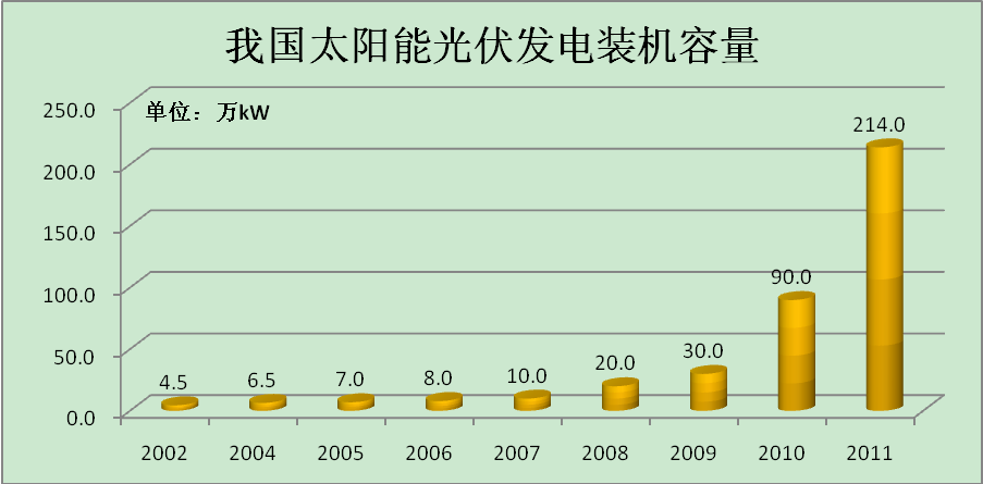 2011年,我國(guó)太陽能光伏發(fā)電并網(wǎng)裝機(jī)容量達(dá)到214萬千瓦。