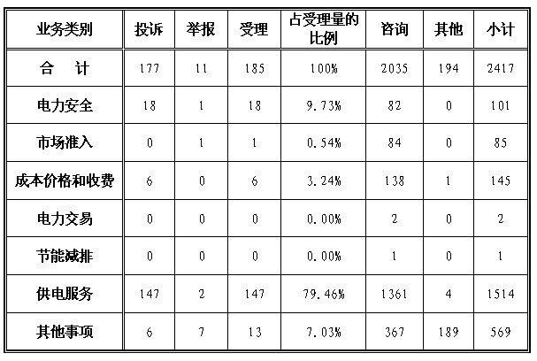 ????(二)辦理情況 ????根據(jù)國家有關(guān)法律法規(guī)規(guī)定,對2014年1月收到的188件投訴舉報中的185件進(jìn)行了受理,占投訴舉報量的98.41%;對不屬于監(jiān)管職責(zé)范圍的3件不予受理,占投訴舉報量的1.59%。 ????截止到2014年1月底,已辦理完畢96件,占投訴舉報受理量的51.89%;對未辦結(jié)的89件結(jié)轉(zhuǎn)2014年2月辦理,占投訴舉報受理量的48.11%。 ????(三)業(yè)務(wù)分類情況 ????2014年1月,能源監(jiān)管機構(gòu)收到的2417件有效信息中,供電服務(wù)1514件,成本價格和收費145件,市場準(zhǔn)入85件,電力安全101件,電力交易2件,節(jié)能減排1件,其他事項569件。 ????從收到的投訴舉報情況看,供電服務(wù)方面149件,受理147件,占受理量的79.46%;電力安全方面19件,受理18件,占受理量的9.73%,其他事項方面13件,受理13件,占受理量的7.03%。(2014年1月投訴舉報業(yè)務(wù)分類情況見表二) 表二 2014年1月投訴舉報業(yè)務(wù)分類情況 ????單位:件