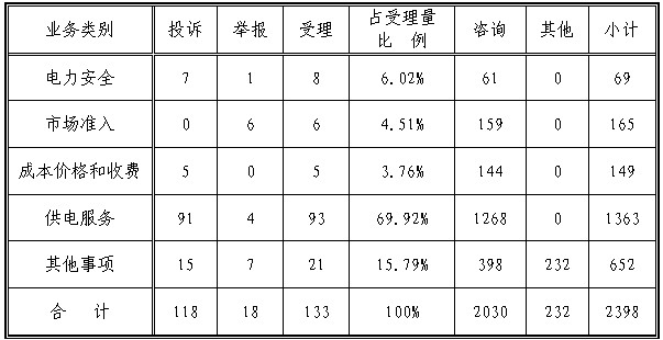 ??? (二)投訴舉報辦理情況 ????根據(jù)國家有關(guān)法律法規(guī)規(guī)定,對2014年3月收到的136件投訴舉報中的133件進(jìn)行了受理,占投訴舉報量的97.79%;不屬于監(jiān)管職責(zé)范圍的3件不予受理,占投訴舉報量的2.21%。 ????到2014年3月31日,3月份受理的投訴舉報辦理完畢72件,占3月份投訴舉報受理量的54.13%;未辦結(jié)64件結(jié)轉(zhuǎn)2014年4月辦理,占3月份受理量的48.12%。 ????(三)業(yè)務(wù)分類情況 ????在2014年3月收到的2398件有效信息中,供電服務(wù)1363件,成本價格和收費149件,市場準(zhǔn)入165件,電力安全69件,其他事項652件。 ????在2014年3月收到的136件投訴舉報中,供電服務(wù)方面95件,受理93件,占受理量的69.92%;電力安全方面8件,受理8件,占受理量的6.02%;市場準(zhǔn)入方面6件,受理6件,占受理量的4.51%;成本價格和收費方面5件,受理5件,占受理量的3.76%;其他事項方面22件,受理21件,占受理量的15.79%。(2014年3月有效信息按業(yè)務(wù)分類情況見表二) 表二 2014年3月有效信息按業(yè)務(wù)分類情況 單位:件