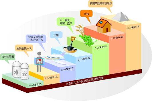 生活中的輻射 ??? 小知識(shí):天然本底輻射人類時(shí)刻都在經(jīng)受著各類天然射線的照射,如宇宙射線,存在于土壤、巖石、水和大氣中的鈾-238、鈾-235、钚-232、鉀-40等,這些天然射線的照射就是天然本底輻射。 |