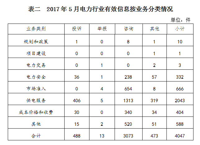 ????(二)分類情況 ????2017年5月收到的有效信息中,電力行業(yè)類4047件,占72.57%;新能源和可再生能源行業(yè)類581件,占10.41%;石油天然氣行業(yè)類44件,占0.79%;煤炭行業(yè)類7件,占0.13%;其他事項898件,占16.10%。 ????投訴舉報主要集中在電力行業(yè),共501件。從業(yè)務(wù)分類情況看,規(guī)劃和政策方面1件,占0.20%;電力交易方面1件,占0.20%;電力安全方面37件,占7.39%;市場準(zhǔn)入方面4件,占0.80%;供電服務(wù)方面411件,占82.03%;成本價格和收費方面30件,占5.99%;其他方面17件,占3.39%。(2017年5月電力行業(yè)有效信息按業(yè)務(wù)分類情況見表二)。
