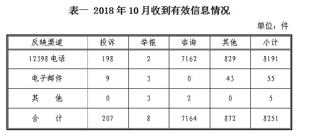 三、分布情況 各?。ㄗ灾螀^(qū)、直轄市)按照收到的有效信息數(shù)量排序,河南、河北、上海、山東、陜西等排在全國(guó)前10位;按照投訴舉報(bào)數(shù)量排序,河南、河北、內(nèi)蒙古、四川、陜西等排在全國(guó)前10位。按照百萬(wàn)人均投訴舉報(bào)數(shù)量排序,內(nèi)蒙古、天津、陜西、青海、寧夏等排在全國(guó)前10位。(2018年10月有效信息及投訴舉報(bào)排名前10位情況見(jiàn)表三)?