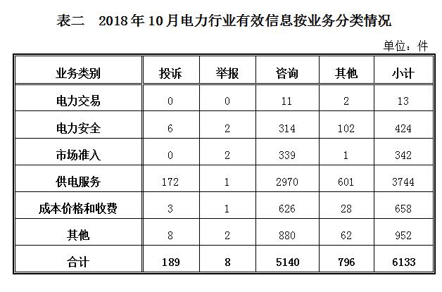 二、分類(lèi)情況 2018年10月收到的有效信息中,電力行業(yè)類(lèi)6133件,占74.33%;新能源和可再生能源行業(yè)類(lèi)819件,占9.93%;石油天然氣行業(yè)類(lèi)320件,占3.88%;煤炭行業(yè)類(lèi)8件,占0.10%;其他事項(xiàng)974件,占11.80%。 投訴舉報(bào)主要集中在電力行業(yè),共197件。從業(yè)務(wù)分類(lèi)情況看,電力安全方面8件,占4.06%;市場(chǎng)準(zhǔn)入方面2件,占1.02%;供電服務(wù)方面173件,占87.82%;成本價(jià)格和收費(fèi)方面4件,占2.03%;其他方面10件,占5.08%。(2018年10月電力行業(yè)有效信息按業(yè)務(wù)分類(lèi)情況見(jiàn)表二)。