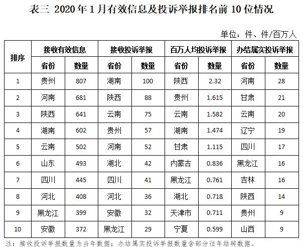 三、分布情況 各?。ㄗ灾螀^(qū)、直轄市)按照收到的有效信息數(shù)量排序,貴州、河南、陜西、湖南、云南等列全國(guó)前10位;按照投訴舉報(bào)數(shù)量排序,湖南、陜西、云南、貴州、河南等排在全國(guó)前10位;按照百萬(wàn)人均投訴舉報(bào)數(shù)量排序,陜西,貴州,云南,湖南,甘肅等排在全國(guó)前10位;按照辦結(jié)屬實(shí)投訴舉報(bào)數(shù)量排序,河南、甘肅、云南、遼寧、四川等排在全國(guó)前10位。(2020年1月有效信息及投訴舉報(bào)排名前10位情況見(jiàn)表三)