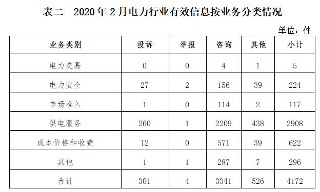 二、分類情況 2020年2月收到的有效信息中: 電力行業(yè)排在首位,有效信息數(shù)量為4172件,占全部有效信息的86.20%;其中受理的投訴舉報數(shù)量235件,占全部投訴舉報數(shù)量的76.30%。群眾反映的問題主要集中在供電服務(wù)、電力安全、成本價格和收費等方面。(2020年2月電力行業(yè)有效信息按業(yè)務(wù)分類情況見表二) 新能源和可再生能源行業(yè)排在第二位,有效信息數(shù)量為227件,占全部有效信息的4.69%;其中受理的投訴舉報數(shù)量為2件,占全部投訴舉報數(shù)量的0.65%。群眾反映了分布式光伏發(fā)電項目并網(wǎng)驗收、補貼結(jié)算等問題。 石油天然氣行業(yè)排在第三位,有效信息數(shù)量為131件,占全部有效信息的2.71%。有效信息主要集中于咨詢居民燃?xì)獍惭b及收費、反映燃?xì)夤收蠁栴}等方面。 其他有效信息合計310件,占全部有效信息的6.40%。其中涉及煤炭行業(yè)的主要內(nèi)容是咨詢煤炭相關(guān)產(chǎn)業(yè)政策、查詢煤礦項目信息等方面。