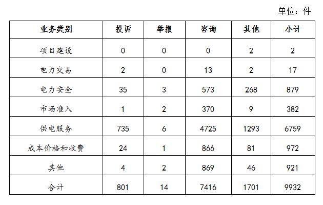 二、分類情況 2020年8月收到的有效信息中: 電力行業(yè)排在首位,有效信息數(shù)量為9932件,占全部有效信息的87.08%;其中受理的投訴舉報數(shù)量775件,占全部投訴舉報數(shù)量的92.48%。群眾反映問題主要集中在供電服務(wù)、成本價格和收費等方面。(2020年8月電力行業(yè)有效信息按業(yè)務(wù)分類情況見表二) 新能源和可再生能源行業(yè)排在第二位,有效信息數(shù)量為529件,占全部有效信息的4.64%;其中受理的投訴舉報數(shù)量為21件,占全部投訴舉報數(shù)量的2.51%。群眾反映的問題主要集中在分布式光伏發(fā)電項目上網(wǎng)電費和補(bǔ)貼結(jié)算等方面。 石油天然氣行業(yè)排在第三位,有效信息數(shù)量為290件,占全部有效信息的2.54%。有效信息主要集中于咨詢居民燃?xì)獍惭b、反映燃?xì)夤收蠁栴}等方面。 其他有效信息合計655件,占全部有效信息的5.74%。其中涉及煤炭行業(yè)的主要內(nèi)容是咨詢煤炭相關(guān)產(chǎn)業(yè)政策、查詢煤礦項目信息等方面。