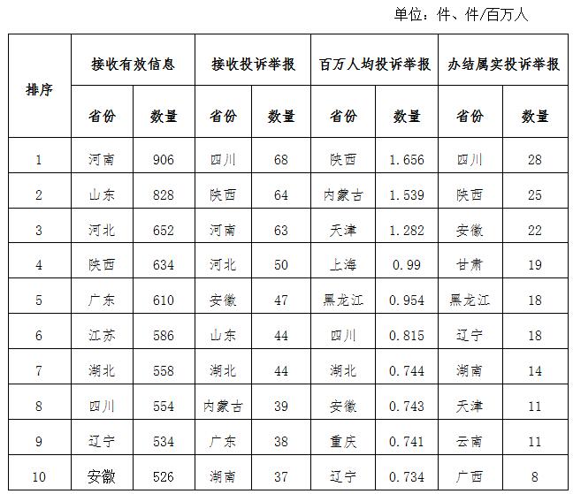 三、分布情況 各省(自治區(qū)、直轄市)按照收到的有效信息數(shù)量排序,河南、山東、河北、陜西、廣東、江蘇、湖北、四川、遼寧、安徽等排在全國前10位;按照投訴舉報數(shù)量排序,四川、陜西、河南、河北、安徽、山東、湖北、內(nèi)蒙古、廣東、湖南等排在全國前10位;按照百萬人均投訴舉報數(shù)量排序,陜西、內(nèi)蒙古、天津、上海、黑龍江、四川、湖北、安徽、重慶、遼寧等排在全國前10位;按照辦結(jié)屬實投訴舉報數(shù)量排序,四川、陜西、安徽、甘肅、黑龍江、遼寧、湖南、天津、云南、廣西等排在全國前10位。(2020年8月有效信息及投訴舉報排名前10位情況見表三) 表三 2020年8月有效信息及投訴舉報排名前10位情況