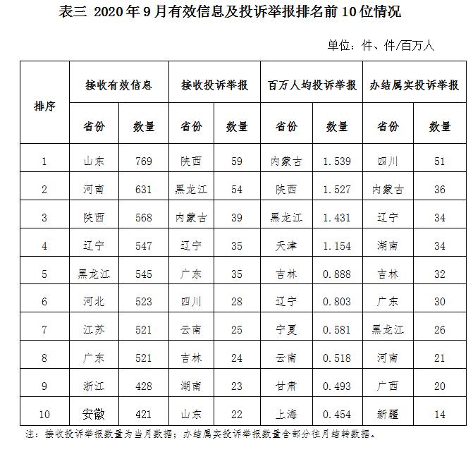 三、分布情況 各?。ㄗ灾螀^(qū)、直轄市)按照收到的有效信息數(shù)量排序,山東、河南、陜西、遼寧、黑龍江、河北、江蘇、廣東、浙江、安徽等列全國前10位;按照投訴舉報(bào)數(shù)量排序,陜西、黑龍江、內(nèi)蒙古、遼寧、廣東、四川、云南、吉林、湖南、山東等排在全國前10位;按照百萬人均投訴舉報(bào)數(shù)量排序,內(nèi)蒙古、陜西、黑龍江、天津、吉林、遼寧、寧夏、云南、甘肅、上海等排在全國前10位; 按照辦結(jié)屬實(shí)投訴舉報(bào)數(shù)量排序,四川、內(nèi)蒙古、遼寧、湖南、吉林、廣東、黑龍江、河南、廣西、新疆等排在全國前10位。(2020年9月有效信息及投訴舉報(bào)排名前10位情況見表三)