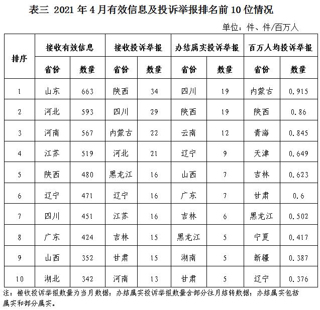 石油天然氣行業(yè)排在第二位,有效信息數(shù)量為564件,占全部有效信息的6.48%。群眾關(guān)注的內(nèi)容主要集中于居民燃?xì)庠O(shè)備故障、費(fèi)用交納等方面。 新能源和可再生能源行業(yè)排在第三位,有效信息數(shù)量為526件,占全部有效信息的6.05%。群眾關(guān)注的內(nèi)容主要集中于居民分布式光伏發(fā)電項(xiàng)目電費(fèi)結(jié)算等方面。 其他有效信息合計(jì)721件,占全部有效信息的8.29%。其中群眾對于煤炭行業(yè)關(guān)注的內(nèi)容主要集中于煤礦開采、煤炭價(jià)格等方面。 三、分布情況 各?。ㄗ灾螀^(qū)、直轄市)按照收到的有效信息數(shù)量排序,山東、河北、河南、江蘇、陜西、遼寧、四川、廣東、山西、湖北等列全國前10位;按照投訴舉報(bào)數(shù)量排序,陜西、四川、內(nèi)蒙古、河北、黑龍江、遼寧、江蘇、吉林、甘肅、河南等排在全國前10位;按照辦結(jié)屬實(shí)投訴舉報(bào)數(shù)量排序,四川、陜西、云南、遼寧、山西、廣東、吉林、黑龍江、湖南、甘肅等排在全國前10位;按照百萬人均投訴舉報(bào)數(shù)量排序,內(nèi)蒙古、陜西、青海、天津、吉林、甘肅、黑龍江、寧夏、新疆、遼寧等排在全國前10位。(2021年4月有效信息及投訴舉報(bào)排名前10位情況見表三)