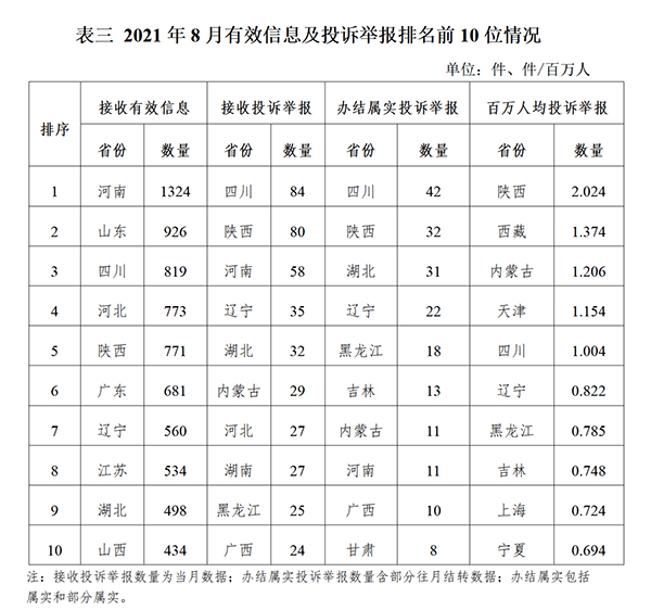 新能源和可再生能源行業(yè)排在第二位,有效信息數(shù)量為956件,占全部有效信息的7.66%。群眾關(guān)注的內(nèi)容主要集中在居民分布式光伏發(fā)電項目并網(wǎng)、電費結(jié)算咨詢等方面。 石油天然氣行業(yè)排在第三位,有效信息數(shù)量為688件,占全部有效信息的5.51%。群眾關(guān)注的內(nèi)容主要集中在居民燃?xì)庠O(shè)備故障、居民燃?xì)鈭笱b咨詢等方面。 其他有效信息合計1072件,占全部有效信息的8.59%。其中涉及煤炭行業(yè)的主要集中在煤炭行業(yè)政策咨詢等方面。 三、分布情況 各省(自治區(qū)、直轄市)按照接收的有效信息數(shù)量排序,河南、山東、四川、河北、陜西、廣東、遼寧、江蘇、湖北、山西列全國前10位;按照接收的投訴舉報數(shù)量排序,四川、陜西、河南、遼寧、湖北、內(nèi)蒙古、河北、湖南、黑龍江、廣西排在全國前10位;按照辦結(jié)屬實的投訴舉報數(shù)量排序,四川、陜西、湖北、遼寧、黑龍江、吉林、內(nèi)蒙古、河南、廣西、甘肅排在全國前10位;按照百萬人均投訴舉報數(shù)量排序,陜西、西藏、內(nèi)蒙古、天津、四川、遼寧、黑龍江、吉林、上海、寧夏排在全國前10位。(2021年8月有效信息及投訴舉報排名前10位情況見表三)