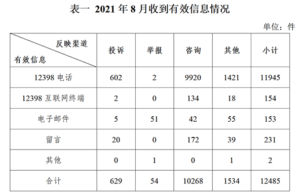 一、基本情況 2021年8月,國家能源局12398能源監(jiān)管熱線(以下簡稱12398熱線)共收到有效信息12485件(包含投訴、舉報、咨詢和其他訴求類別),環(huán)比減少2.63%,同比增加9.46%。(2021年8月收到有效信息情況見表一)