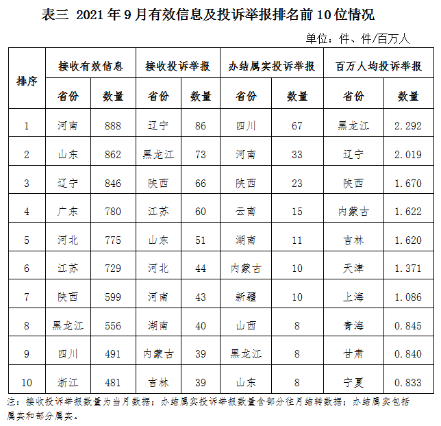 石油天然氣行業(yè)排在第二位,有效信息數(shù)量為918件,占全部有效信息的7.47%。群眾關(guān)注的內(nèi)容主要集中在居民燃?xì)庠O(shè)備故障、居民燃?xì)鈭?bào)裝等方面。 新能源和可再生能源行業(yè)排在第三位,有效信息數(shù)量為741件,占全部有效信息的6.03%。群眾關(guān)注的內(nèi)容主要集中在居民分布式光伏發(fā)電項(xiàng)目并網(wǎng)、電費(fèi)結(jié)算等方面。 其他有效信息合計(jì)1231件,占全部有效信息的10.01%。其中涉及煤炭行業(yè)的主要集中在煤炭行業(yè)政策、煤礦項(xiàng)目信息等方面。 三、分布情況 各?。ㄗ灾螀^(qū)、直轄市)按照接收的有效信息數(shù)量排序,河南、山東、遼寧、廣東、河北、江蘇、陜西、黑龍江、四川、浙江列全國(guó)前10位;按照接收的投訴舉報(bào)數(shù)量排序,遼寧、黑龍江、陜西、江蘇、山東、河北、河南、湖南、內(nèi)蒙古、吉林排在全國(guó)前10位;按照辦結(jié)屬實(shí)的投訴舉報(bào)數(shù)量排序,四川、河南、陜西、云南、湖南、內(nèi)蒙古、新疆、山西、黑龍江、山東排在全國(guó)前10位;按照百萬(wàn)人均投訴舉報(bào)數(shù)量排序,黑龍江、遼寧、陜西、內(nèi)蒙古、吉林、天津、上海、青海、甘肅、寧夏排在全國(guó)前10位。(2021年9月有效信息及投訴舉報(bào)排名前10位情況見(jiàn)表三)