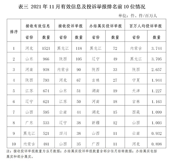 石油天然氣行業(yè)排在第二位,有效信息數(shù)量為2161件,占全部有效信息的16.71%。群眾關(guān)注的內(nèi)容主要集中在居民燃?xì)庠O(shè)備故障、居民燃?xì)鈭?bào)裝等方面。 新能源和可再生能源行業(yè)排在第三位,有效信息數(shù)量為733件,占全部有效信息的5.67%。群眾關(guān)注的內(nèi)容主要集中在居民分布式光伏發(fā)電項(xiàng)目并網(wǎng)、電費(fèi)結(jié)算等方面。 其他有效信息合計(jì)1411件,占全部有效信息的10.91%。其中涉及煤炭行業(yè)的主要集中在煤炭行業(yè)政策、煤礦項(xiàng)目信息等方面。 三、分布情況 各?。ㄗ灾螀^(qū)、直轄市)按照接收的有效信息數(shù)量排序,河北、山東、河南、陜西、江蘇、遼寧、山西、廣東、黑龍江、內(nèi)蒙古排在全國(guó)前10位;按照接收的投訴舉報(bào)數(shù)量排序,黑龍江、陜西、內(nèi)蒙古、河北、山東、江蘇、云南、遼寧、四川、山西排在全國(guó)前10位;按照辦結(jié)屬實(shí)的投訴舉報(bào)數(shù)量排序,黑龍江、遼寧、陜西、吉林、湖南、河南、湖北、新疆、廣西、山西排在全國(guó)前10位;按照百萬(wàn)人均投訴舉報(bào)數(shù)量排序,內(nèi)蒙古、黑龍江、陜西、寧夏、天津、吉林、西藏、山西、云南、河北排在全國(guó)前10位。(2021年11月有效信息及投訴舉報(bào)排名前10位情況見表三)