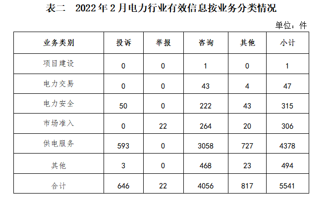 按訴求性質(zhì)分類,投訴665件,占有效信息的7.95%;舉報(bào)22件,占有效信息的0.26%;咨詢6832件,占有效信息的81.67%;表揚(yáng)、求助、建議等其他方面847件,占有效信息的10.12%。 按反映渠道分類,12398電話8029件,12398互聯(lián)網(wǎng)終端164件,電子郵件64件,留言109件。 二、分類情況 2022年2月收到的有效信息中: 電力行業(yè)排在首位,有效信息數(shù)量為5541件,占全部有效信息的66.24%。群眾關(guān)注的內(nèi)容主要集中在供電服務(wù)、電力安全、成本價(jià)格和收費(fèi)等方面。(2022年2月電力行業(yè)有效信息按業(yè)務(wù)分類情況見表二)