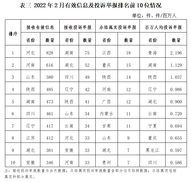 石油天然氣行業(yè)排在第二位,有效信息數(shù)量為1563件,占全部有效信息的18.68%。群眾關(guān)注的內(nèi)容主要集中在咨詢居民燃?xì)獍惭b及收費(fèi)、反映燃?xì)夤收蠁栴}等方面。 新能源和可再生能源行業(yè)排在第三位,有效信息數(shù)量為401件,占全部有效信息的4.79%。群眾關(guān)注的內(nèi)容主要集中在居民分布式光伏發(fā)電項(xiàng)目并網(wǎng)、電費(fèi)結(jié)算等方面。 其他有效信息合計(jì)861件,占全部有效信息的10.29%。其中涉及煤炭行業(yè)的主要集中在煤炭行業(yè)政策、煤礦項(xiàng)目信息等方面。 三、分布情況 各?。ㄗ灾螀^(qū)、直轄市)按照接收的有效信息數(shù)量排序,河北、河南、山東、陜西、湖南、四川、遼寧、江蘇、湖北、安徽排在全國前10位;按照接收的投訴舉報(bào)數(shù)量排序,湖南、湖北、四川、遼寧、陜西、山東、云南、河北、安徽、河南排在全國前10位;按照辦結(jié)屬實(shí)的投訴舉報(bào)數(shù)量排序,江西、重慶、陜西、河南、廣西、內(nèi)蒙古、甘肅、山東、湖北、貴州排在全國前10位;按照百萬人均投訴舉報(bào)數(shù)量排序,青海、湖南、陜西、遼寧、湖北、云南、寧夏、重慶、黑龍江、四川排在全國前10位。(2022年2月有效信息及投訴舉報(bào)排名前10位情況見表三)