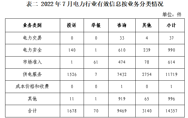 按訴求性質(zhì)分類,投訴1732件,占有效信息的9.22%;舉報71件,占有效信息的0.38%;咨詢13737件,占有效信息的73.14%;表揚、求助、建議等其他方面3242件,占有效信息的17.26%。 按反映渠道分類,12398電話16469件,12398互聯(lián)網(wǎng)終端1713件,電子郵件173件,留言427件。 二、分類情況 2022年7月收到的有效信息中: 電力行業(yè)排在首位,有效信息數(shù)量為14357件,占全部有效信息的76.44%。群眾關(guān)注的內(nèi)容主要集中在供電服務(wù)、電力安全、市場準(zhǔn)入等方面。(2022年7月電力行業(yè)有效信息按業(yè)務(wù)分類情況見表二)