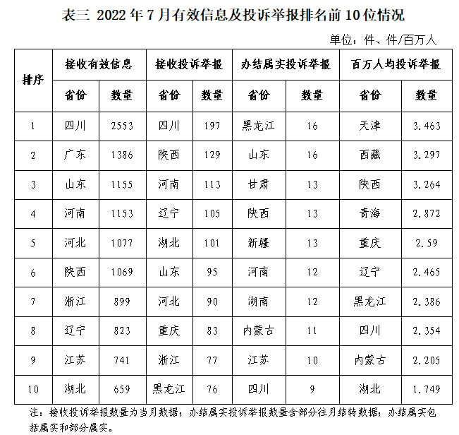 石油天然氣行業(yè)排在第二位,有效信息數(shù)量為2376件,占全部有效信息的12.65%。群眾關(guān)注的內(nèi)容主要集中在咨詢居民燃?xì)獍惭b及收費、燃?xì)夤收蠁栴}等方面。 新能源和可再生能源行業(yè)排在第三位,有效信息數(shù)量為883件,占全部有效信息的4.70%。群眾關(guān)注的內(nèi)容主要集中在分布式光伏發(fā)電項目并網(wǎng)、電費結(jié)算、補貼發(fā)放等方面。 煤炭行業(yè)有效信息數(shù)量為41件,占全部有效信息的0.22%,主要問題集中在煤炭行業(yè)政策、煤炭價格、煤礦項目信息等方面。 其他有效信息合計1125件,占全部有效信息的5.99%。 三、分布情況 各?。ㄗ灾螀^(qū)、直轄市)按照接收的有效信息數(shù)量排序,四川、廣東、山東、河南、河北、陜西、浙江、遼寧、江蘇、湖北排在全國前10位;按照接收的投訴舉報數(shù)量排序,四川、陜西、河南、遼寧、湖北、山東、河北、重慶、浙江、黑龍江排在全國前10位;按照辦結(jié)屬實的投訴舉報數(shù)量排序,黑龍江、山東、甘肅、陜西、新疆、河南、湖南、內(nèi)蒙古、江蘇、四川排在全國前10位;按照百萬人均投訴舉報數(shù)量排序,天津、西藏、陜西、青海、重慶、遼寧、黑龍江、四川、內(nèi)蒙古、湖北排在全國前10位。(2022年7月有效信息及投訴舉報排名前10位情況見表三)