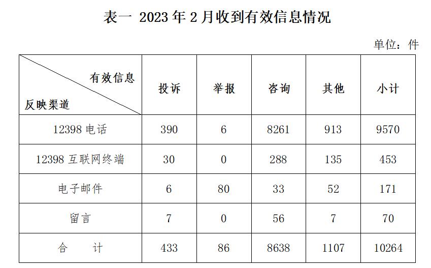 一、基本情況 2023年2月,國家能源局12398能源監(jiān)管熱線(以下簡稱12398熱線)共收到有效信息10264件(包含投訴、舉報、咨詢和其他訴求類別),環(huán)比減少27.07%,同比增加22.69%。(2023年2月收到有效信息情況見表一)