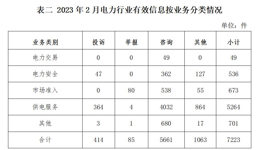 按訴求性質(zhì)分類,投訴433件,占有效信息的4.22%;舉報86件,占有效信息的0.84%;咨詢8638件,占有效信息的84.16%;表揚、求助、建議等其他方面1107件,占有效信息的10.79%。 按反映渠道分類,12398電話9570件,12398互聯(lián)網(wǎng)終端453件,電子郵件171件,留言70件。 二、分類情況 2023年2月收到的有效信息中: 電力行業(yè)排在首位,有效信息數(shù)量為7223件,占全部有效信息的70.37%。群眾關注的內(nèi)容主要集中在供電服務、電力安全、成本價格和收費等方面。(2023年2月電力行業(yè)有效信息按業(yè)務分類情況見表二)