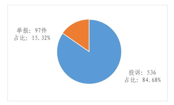 圖一 2023年3月接收投訴舉報分布圖 ?。ㄒ唬┓诸惽闆r 1.按被投訴舉報行業(yè)分類 電力行業(yè)排在首位,數(shù)量為604件、占投訴舉報總數(shù)的95.42%,主要集中在供電服務(wù)、電力安全、電力交易、資質(zhì)許可等方面。(詳見表一)