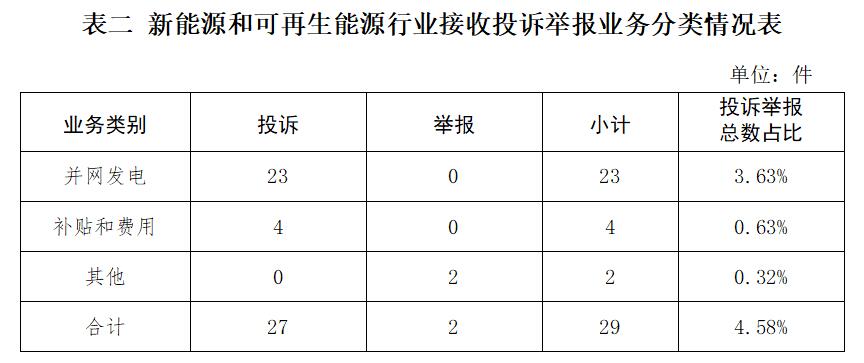 新能源和可再生能源行業(yè)排在第二位,數(shù)量為29件、占投訴舉報總數(shù)的4.58%,主要集中在并網(wǎng)發(fā)電、補貼和費用等方面。(詳見表二)