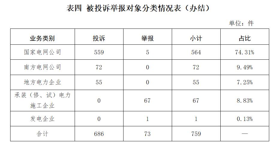 從被投訴舉報對象看,供電企業(yè)691件、占比91.04%,其中國家電網(wǎng)公司564件、占比74.31%,南方電網(wǎng)公司72件、占比9.49%,地方電力企業(yè)55件、占比7.25%;承裝(修、試)電力施工企業(yè)投訴舉報67件、占比8.83%;新能源企業(yè)投訴舉報1件、占比0.13%。(詳見表四)