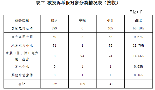 煤炭行業(yè)排在第三位,數(shù)量為1件、占投訴舉報(bào)總數(shù)的0.16%,主要集中在煤炭質(zhì)量方面。 2.按被投訴舉報(bào)對(duì)象分類 供電企業(yè)542件、占投訴舉報(bào)總數(shù)的84.55%,其中國家電網(wǎng)公司405件、占投訴舉報(bào)總數(shù)的63.18%,南方電網(wǎng)公司62件、占投訴舉報(bào)總數(shù)的9.67%,地方電力企業(yè)75件、占投訴舉報(bào)總數(shù)的11.70%;承裝(修、試)電力施工企業(yè)94件、占投訴舉報(bào)總數(shù)的14.66%;發(fā)電企業(yè)4件、占投訴舉報(bào)總數(shù)的0.63%;其他市場主體1件、占投訴舉報(bào)總數(shù)的0.16%。