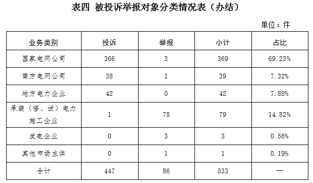 ?。ǘ┑貐^(qū)分布情況 各?。ㄗ灾螀^(qū)、直轄市)按照接收投訴舉報(bào)數(shù)量排序,山東、四川、河北、陜西、內(nèi)蒙古排在全國前5位。其中:按投訴數(shù)量排序,山東、四川、內(nèi)蒙古、陜西、河北排在全國前5位;按舉報(bào)數(shù)量排序,廣東、河北、陜西、四川、河南(浙江)排在全國前5位;按百萬人均投訴舉報(bào)數(shù)量排序,西藏、內(nèi)蒙古、陜西、黑龍江、吉林排在全國前5位。(全國接收投訴舉報(bào)地區(qū)分布情況詳見附件1) ?。ㄈ┲饕獑栴} 2023年4月,接收的投訴舉報(bào)主要反映了四個(gè)方面的問題。 1.承裝(修、試)電力設(shè)施許可問題。少數(shù)企業(yè)提供虛假材料,使用其他企業(yè)員工相關(guān)證件申請(qǐng)承裝(修、試)電力設(shè)施許可證。 投訴舉報(bào)量靠前的2個(gè)省份為廣東(13件)、河北(12件)。 2.電能質(zhì)量問題。部分地區(qū)供電設(shè)施老舊,網(wǎng)架比較薄弱,供電半徑長、供電線徑小,導(dǎo)致出現(xiàn)頻繁停電、低電壓等電能質(zhì)量問題。 投訴舉報(bào)量靠前的2個(gè)省份為云南(13件)、四川(7件)。 3.停電搶修問題。個(gè)別供電企業(yè)計(jì)劃檢修安排不合理、搶修力量投入不足,導(dǎo)致停電后未及時(shí)恢復(fù)供電,影響群眾正常用電。 投訴舉報(bào)量靠前的2個(gè)省份為內(nèi)蒙古(9件)、四川(7件)。 4.新能源和可再生能源行業(yè)相關(guān)問題。分布式光伏發(fā)電項(xiàng)目并網(wǎng)存在困難,上網(wǎng)電費(fèi)結(jié)算、補(bǔ)貼轉(zhuǎn)付不及時(shí)等。 投訴舉報(bào)量靠前的2個(gè)省份為山東(4件)、黑龍江(3件)。 二、當(dāng)月處理情況 ?。ㄒ唬┦芾砬闆r 2023年4月,根據(jù)國家有關(guān)法規(guī)政策規(guī)定,國家能源局派出機(jī)構(gòu)對(duì)屬于監(jiān)管職責(zé)范圍的604件投訴舉報(bào)進(jìn)行了受理,占接收數(shù)量的94.23%;其他不予受理的,已按照國家有關(guān)法規(guī)政策進(jìn)行了及時(shí)轉(zhuǎn)辦,并將有關(guān)情況及時(shí)告知了當(dāng)事人。 ?。ǘ┺k結(jié)情況 2023年4月,國家能源局派出機(jī)構(gòu)辦結(jié)投訴舉報(bào)533件(含往期結(jié)轉(zhuǎn)),環(huán)比下降29.78%、同比下降24.18%,累計(jì)辦結(jié)率98.22%。其中:投訴447件,環(huán)比下降34.84%、同比下降32.38%;舉報(bào)86件,環(huán)比增長17.81%、同比增長104.76%。