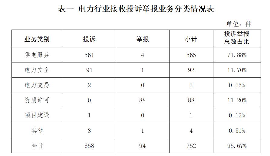 ?。ㄒ唬┓诸惽闆r 1.按被投訴舉報行業(yè)分類 電力行業(yè)排在首位,數(shù)量為752件、占投訴舉報總數(shù)的95.67%,主要集中在供電服務(wù)、電力安全、資質(zhì)許可等方面。