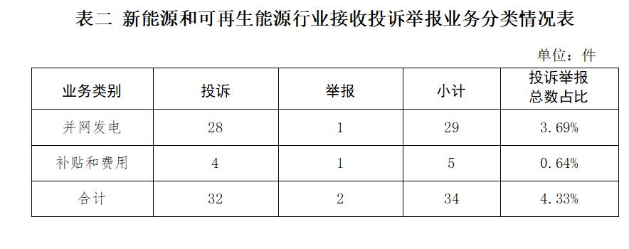 新能源和可再生能源行業(yè)排在第二位,數(shù)量為34件、占投訴舉報總數(shù)的4.33%,主要集中在并網(wǎng)發(fā)電、補貼和費用等方面。